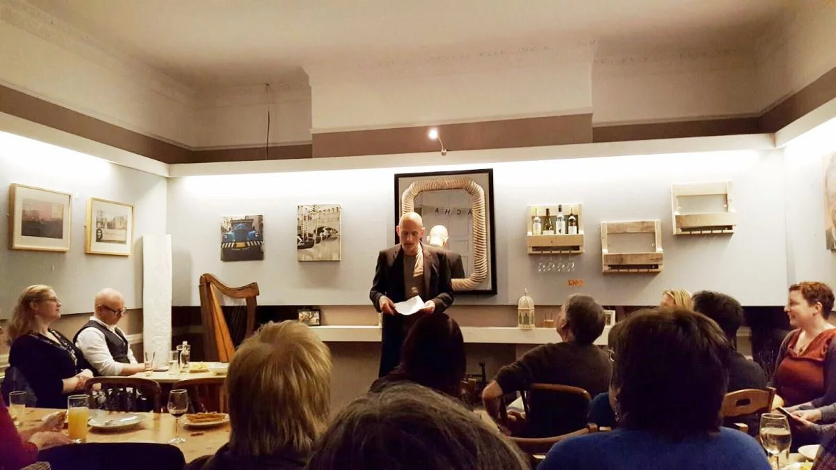 MIKE PERFORMING FLASH FICTION READINGS AT ST JAMES'S WINE VAULTS, BATH UK Dec 2016